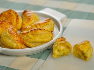 Posez une cuillerée de fondue de poireau de manière à recouvrir la moitié d'un rond de pâte. Badigeonnez les bords avec du jaune d'oeuf et refermez le rond en forme de croissant. Appuyez bien sur les bords pour les sceller. Faites la même chose avec le reste de fondue de poireau et de pâte feuilletée.
